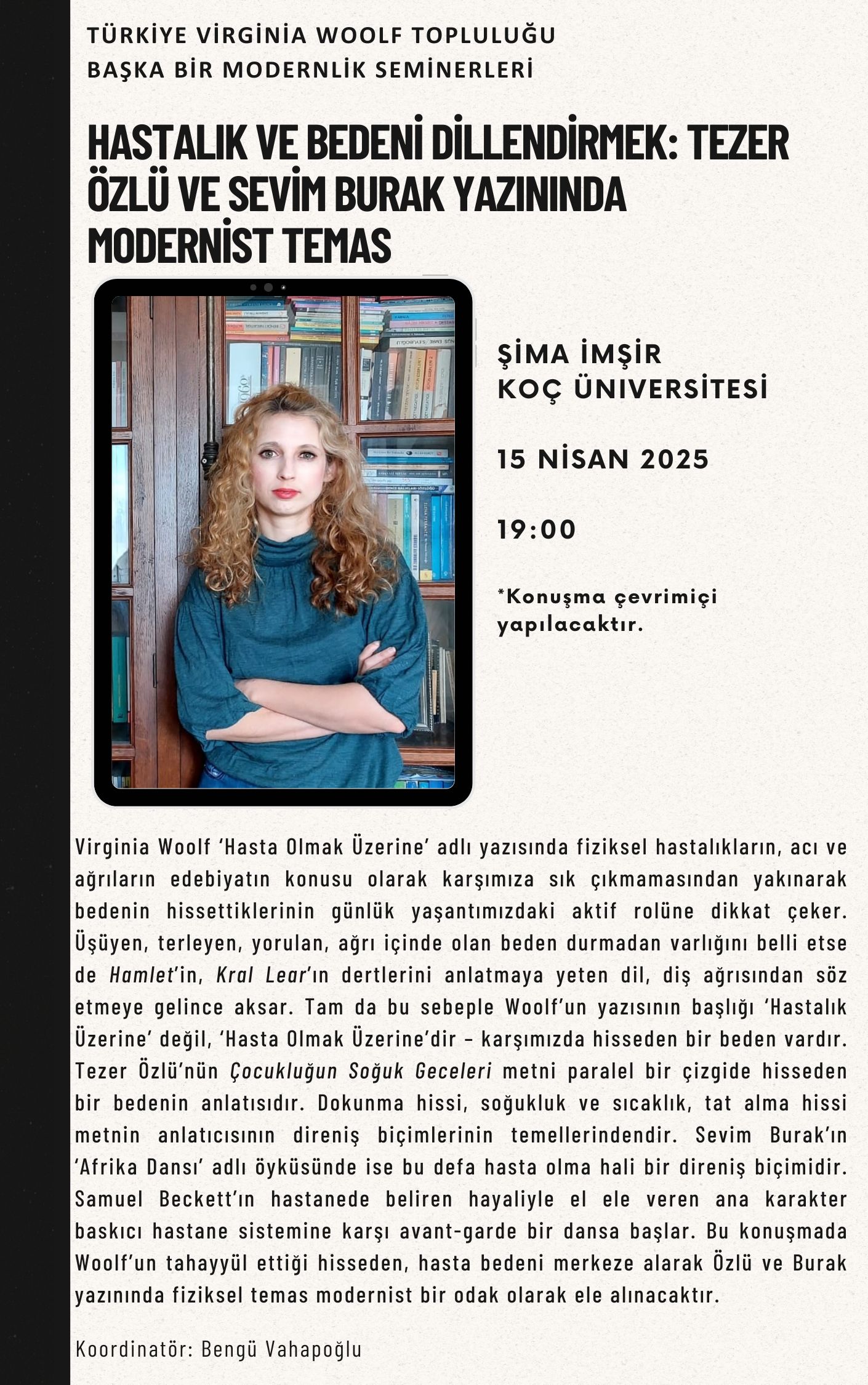 Hastalık ve Bedeni Dillendirmek: Tezer Özlü ve Sevim Burak Yazınında Modernist Temas + Google Takvim'e Ekle + iCal / Outlook dışa aktarma Tarih Nis 15 2025 Süresi doldu! Zaman 19:00 Kategori Başka Bir Modernlik Seminerleri Bu etkinliği paylaşın
