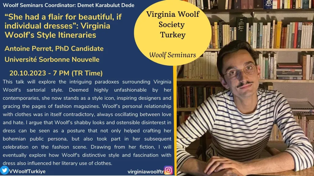This talk will explore the intriguing paradoxes surrounding Virginia Woolf’s sartorial style. Deemed highly unfashionable by her contemporaries, she now stands as a style icon, inspiring designers and gracing the pages of fashion magazines. Woolf’s personal relationship with clothes was in itself contradictory, always oscillating between love and hate. I argue that Woolf’s shabby looks and ostensible disinterest in dress can be seen as a posture that not only helped crafting her bohemian public persona, but also took part in her subsequent celebration on the fashion scene. Drawing from her fiction, I will eventually explore how Woolf’s distinctive style and fascination with dress also influenced her literary use of clothes.