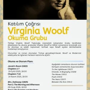Süresi dolmuşVirginia Woolf Okuma Grubu Buluşması Duyurusu Virginia Woolf Okuma Grubumuz, yazarın 1922 yılında yayımlanan ikinci romanı Jacob’s Room’un 7–14. bölümlerini tartışmak üzere 14 Kasım 2025 Perşembe günü saat 18.00’de çevrimiçi olarak bir araya geliyor. Buluşmaya katılmak ve toplantı bağlantısını almak için etkinliğe kayıt yaptırmanız gerekmektedir. Daha önceki oturumlara katılmamış olsanız bile, ilgili bölümleri okuyarak ...